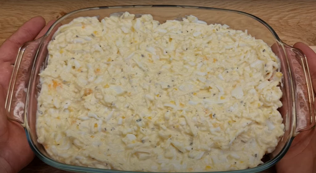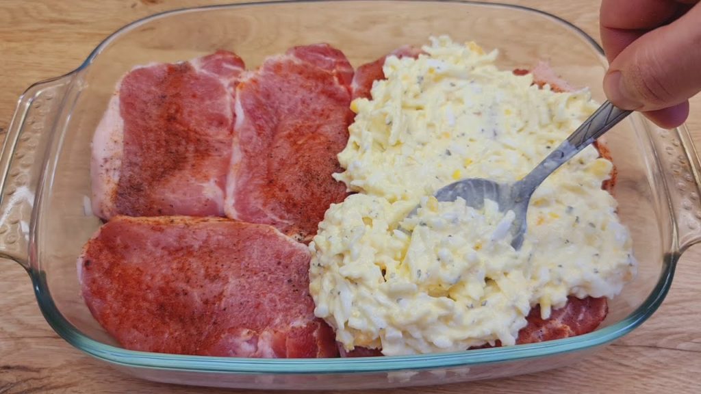 Masę układamy równomiernie na mięsie. Wygładź i upiecz w nagrzanym piekarniku do 180°C. Pieczemy około 40 minut .