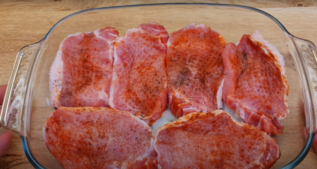 Posolić, doprawić i posypać czerwonym mielonym pieprzem. Pokrój cebulę i ułóż ją na dnie miski żaroodpornej. Kładziemy na niej plastry mięsa.