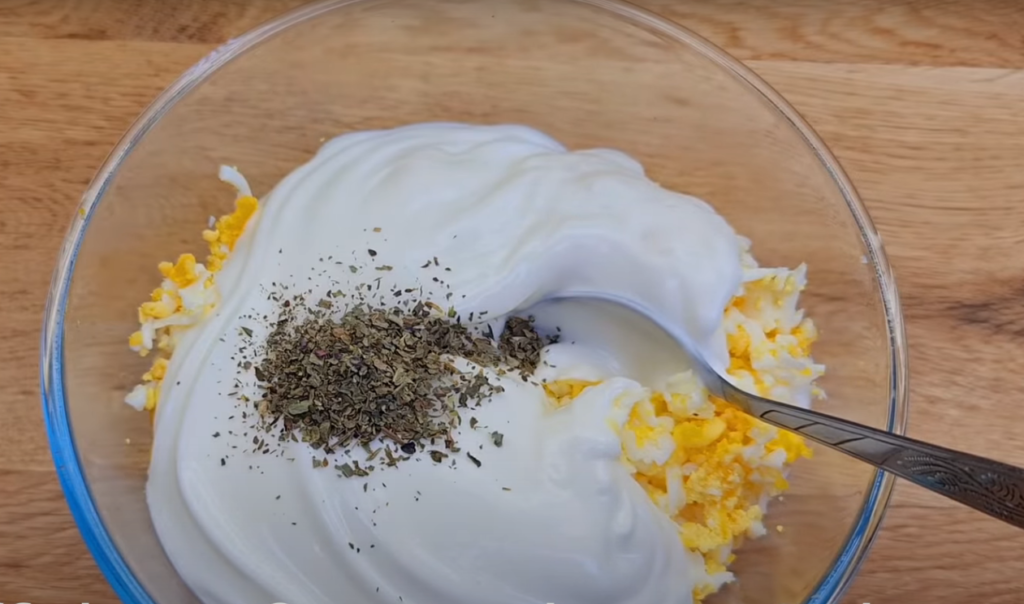 Teraz zetrzyj twardy ser, w tym jajka. Dodaj 6 łyżek jogurtu naturalnego, sól, bazylię i wszystko dobrze wymieszaj.