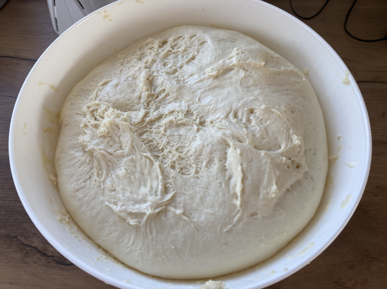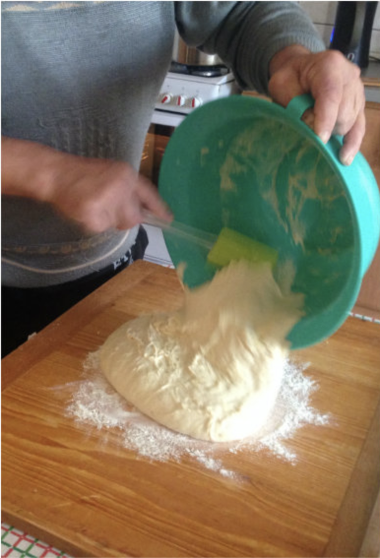 Ciasto jest piękne, miękkie i puszyste. Zakwas obracamy na posypanej mąką desce i dzielimy na 3-4 części.