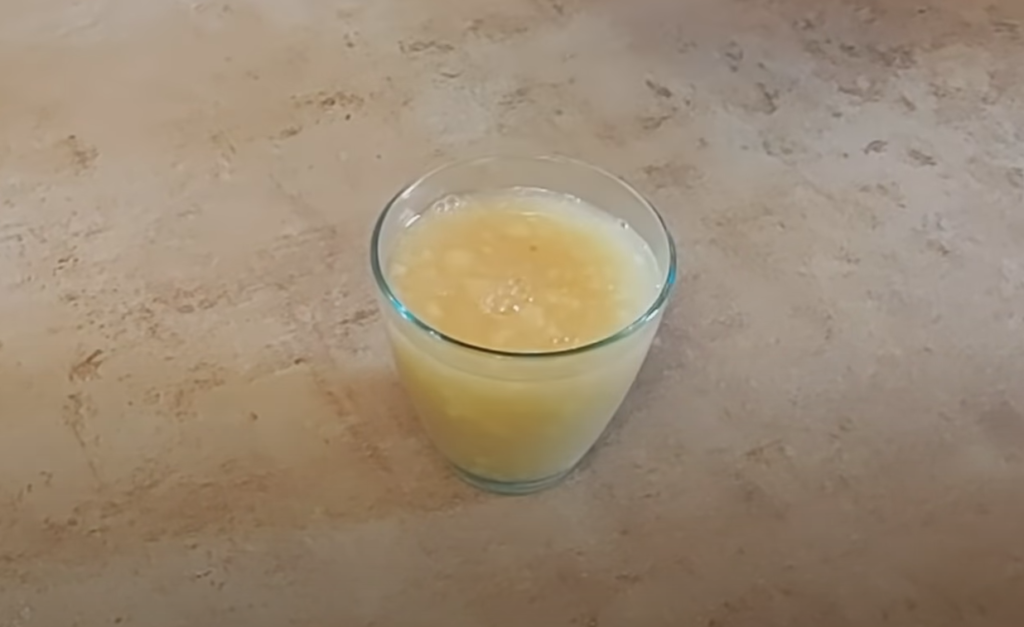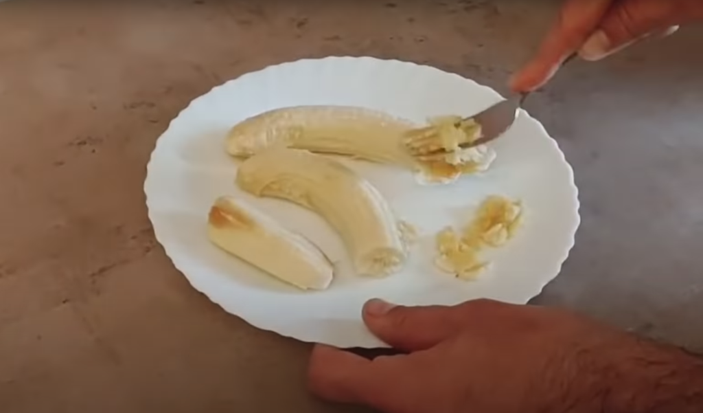 Dwa banany obieramy i wyciskamy widelcem na puree.