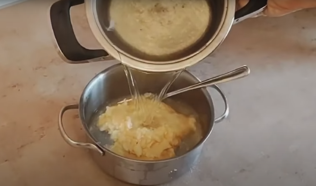 Włóż puree bananowe do garnka. Zalej wrzącą wodą.