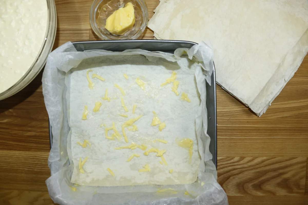 Pokrój lawasz na kawałki w zależności od wielkości formy. Połóż jeden arkusz lawaszu na dnie wyłożonej papierem i posmarowanej masłem formy do pieczenia.