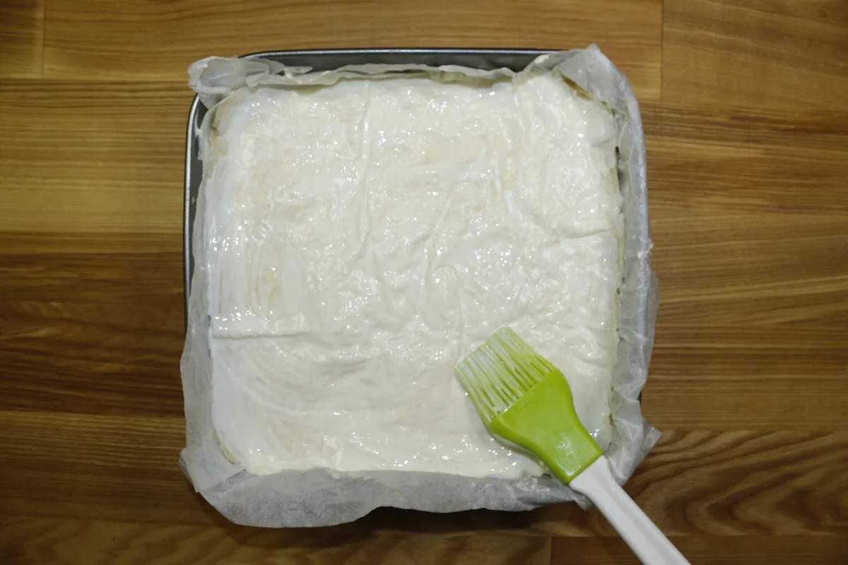 Obficie posmaruj ostatni arkusz kwaśną śmietaną. Możesz również użyć mleka lub kefiru.