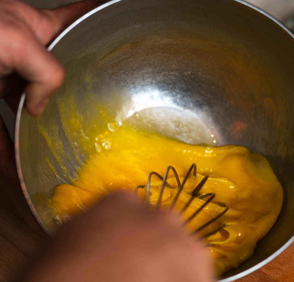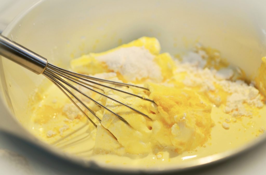 W osobnej misce ubić mikserem białka. Do miski z twarogiem dodać pianę z białek i wymieszać. Następnie włóż masę twarogową do lodówki na 30 minut. Do miski wlać roztopione masło. Dodać cukier i jajka, ubić trzepaczką.