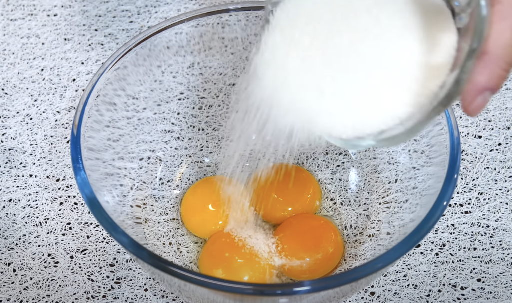Do żółtek dodaj jogurt, 3 łyżki skrobi kukurydzianej i proszek do pieczenia, a następnie dokładnie wymieszaj.