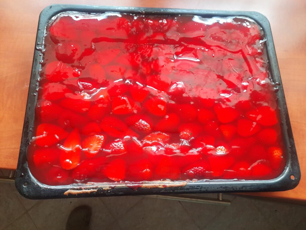 Zalać wodą, chwilę zagotować i przecedzić przez sitko do miski. Truskawki pokroić na małe kawałki i włożyć do miski. Do miski z truskawkami dodajemy wiśnie. Wyjmij schłodzone ciasto z formy. W osobnej misce wymieszaj żelatynę z wodą i odstaw na 5 minut. Do miski ze śmietaną wlać śmietanę. Dodać cukier puder i ubić mikserem.