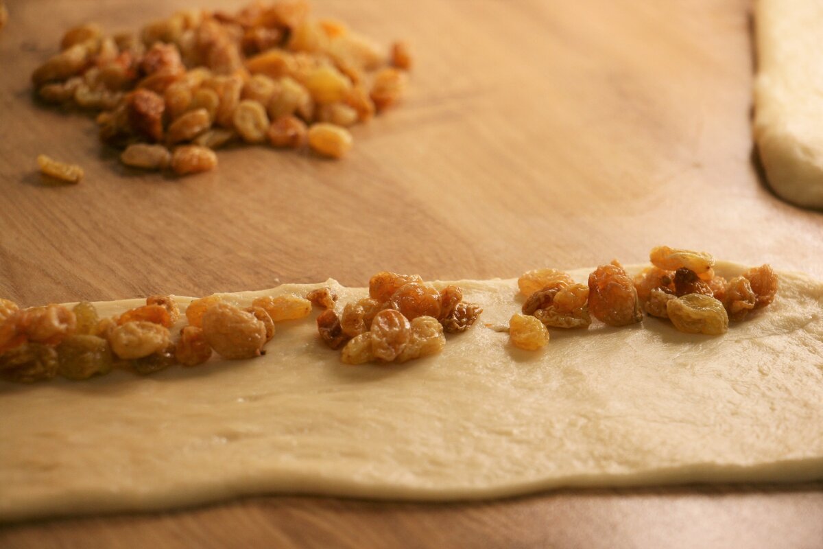 Ciasto rozwałkowujemy, napełniamy rodzynkami, odwracamy, kładziemy na blasze do pieczenia i odstawiamy na godzinę. Kilka razy nie czekałam godziny, wkładam je do piekarnika na 30 minut.