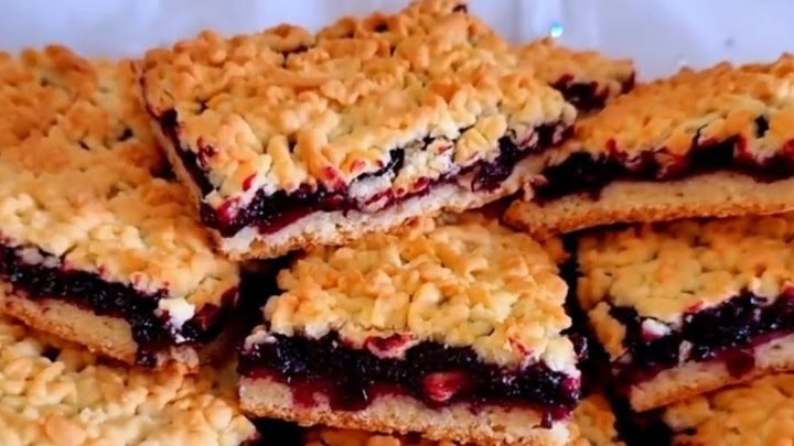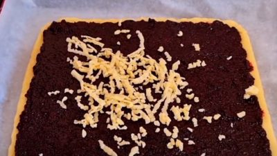 Większą z nich rozwałkuj na placek na posypanym mąką papierze do pieczenia i ułóż na blasze do pieczenia. Nałóż na niego wybrany dżem, jego ilość zależy od Ciebie. Następnie zetrzyj drugą część ciasta na grubej tarce na dżem. Włóż blachę do piekarnika nagrzanego do 180°C i piecz ciasto przez 25 minut.