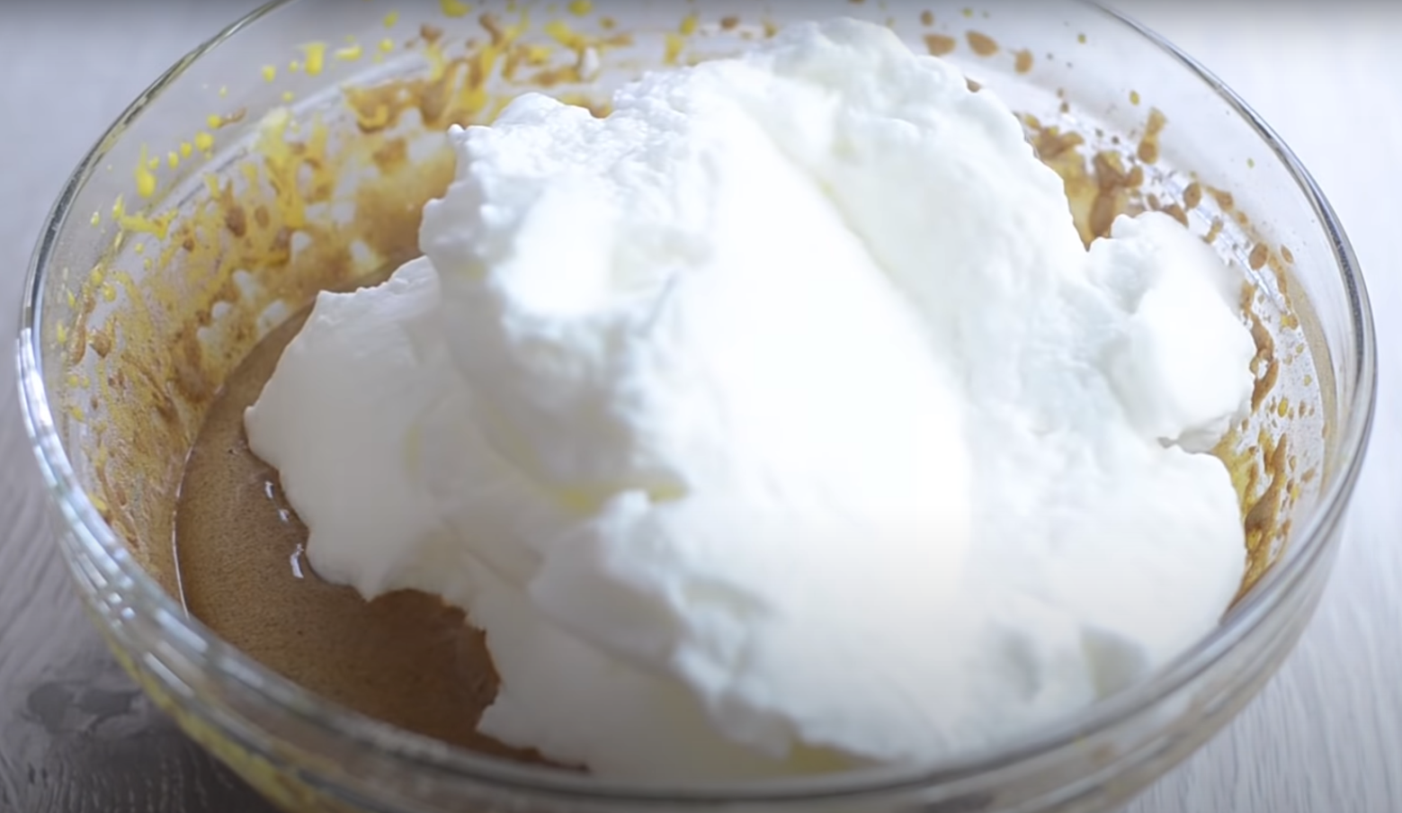 Przejdź do przygotowania ciasta. Mąkę wsyp do osobnej miski, dodaj proszek do pieczenia i wymieszaj, dodaj także kakao. W drugiej misce ubij białka na sztywną pianę. Osobno ubij żółtka z cukrem. Następnie dodaj do nich letnią wodę i przygotowaną wcześniej suchą mieszankę mąki. Delikatnie wymieszaj z ubitymi białkami.
