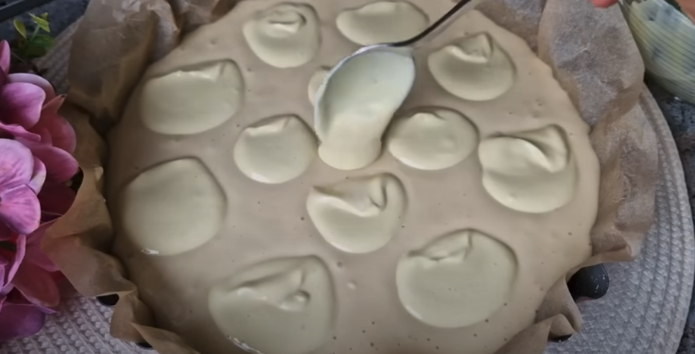 W osobnej misce wymieszaj 150 g świeżego sera z 20 g cukru i aromatem waniliowym. Dodaj 1 jajko i dobrze wymieszaj, aż powstanie gładka masa serowa. Formę o średnicy 26 cm wyłóż papierem do pieczenia lub posmaruj masłem i oprósz mąką. Wlej połowę ciasta do formy i równomiernie rozprowadź.