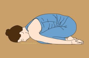 Ponownie usiądź w pozycji tureckiej (ze skrzyżowanymi nogami). Prawą rękę połóż na lewym kolanie. Następnie powoli przesuwaj głowę i ciało w kierunku lewego kolana. Należy pogłębić oddech i wykonywać to ćwiczenie równomiernie.