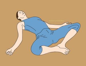 Wyciągnij ręce przed siebie. Lewe kolano powinno być przyciśnięte do klatki piersiowej. Teraz obróć całe ciało do tyłu w prawo, nie odrywając ramion od podłoża. Pozostań w tej pozycji przez około 3 minuty, a następnie zmień stronę. Ta pozycja jest najlepsza dla pleców. Ta pozycja złagodzi ból kości ogonowej i pleców.