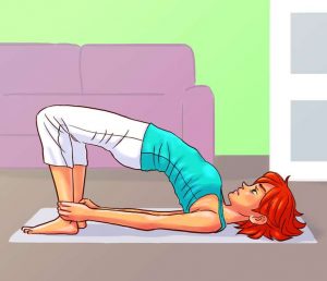 Leżąc na plecach, zginamy kolana i delikatnie rozstawiamy nogi. Ręce w tym czasie leżą swobodnie wzdłuż ciała. Unosimy miednicę i zginamy plecy, starając się nie podnosić przy tym szyi, głowy oraz ramion. Wykonujemy ćwiczenie przez mniej więcej minutę.