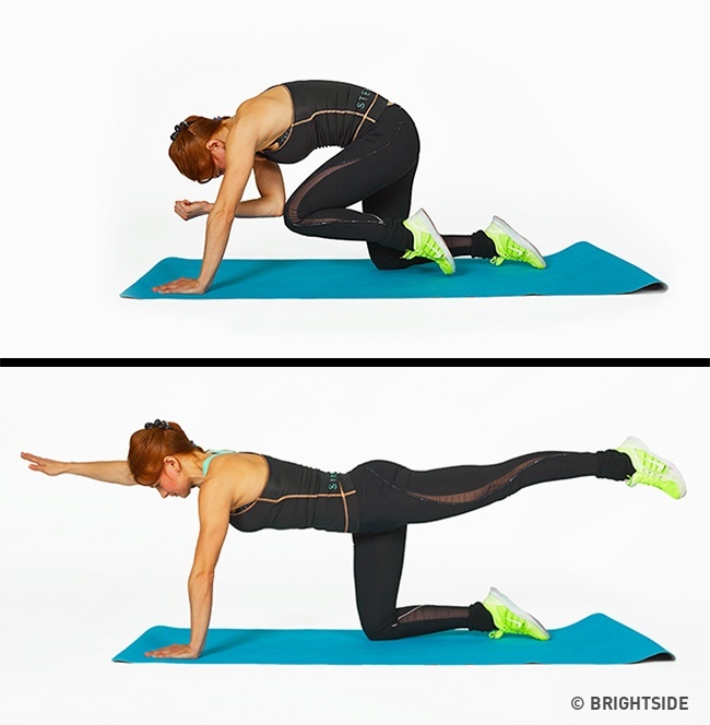 Na początek przyjmij postawę ,,na czworakach”, a następnie jednocześnie wyciągnij lewą nogę i prawą rękę, w taki sposób, aby znajdowały się one w linii prostej. Potem powoli zegnij je i dotknij prawym łokciem do lewego kolana.
