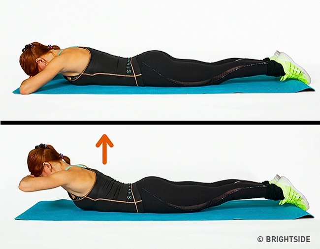 Na początek ułóż się na brzuchu z równocześnie ugiętymi rękami pod twarzą. Unieś górną część ciała na tyle wysoko, na ile dasz radę. W takiej pozycji wytrzymaj kilka sekund, a następnie powoli opuść tułów. To ćwiczenie jest idealne na wzmocnienie kręgosłupa.