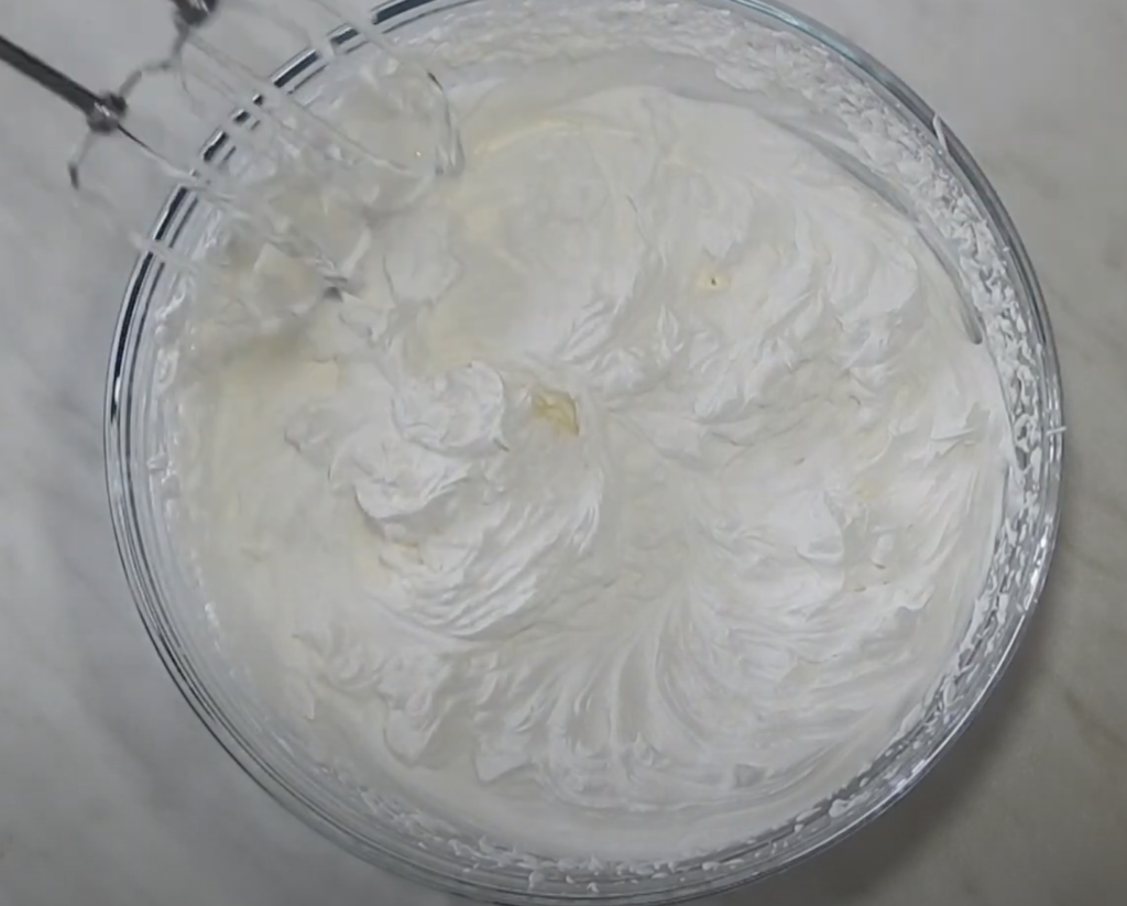 Ubić bitą śmietanę za pomocą trzepaczek – na ciasto wyłożyć krem budyniowy i posmarować bitą śmietaną. Udekoruj według gustu. Ja używam kawałków czekolady i pestek wiśni. Alternatywnie całość można posypać startą czekoladą lub kakao.