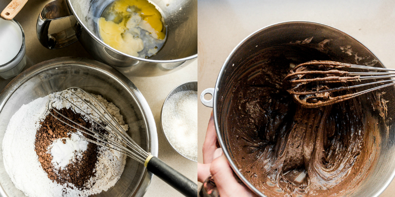Do głębokiej miski wsypać kakao, przesianą mąkę oraz sodę oczyszczoną. Ubić jaja z cukrem i cukrem waniliowym. Dodać stopione masło i wymieszać składniki przy użyciu trzepaczki.