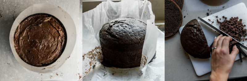 Przygotować formę o średnicy ok. 23-25 cm. Wyłożyć papierem do pieczenia i nasmarować olejem. Wlać ciasto. Piec w przez 40-50 minut w temperaturze 180’C. Upieczone ciasto ostudzić.