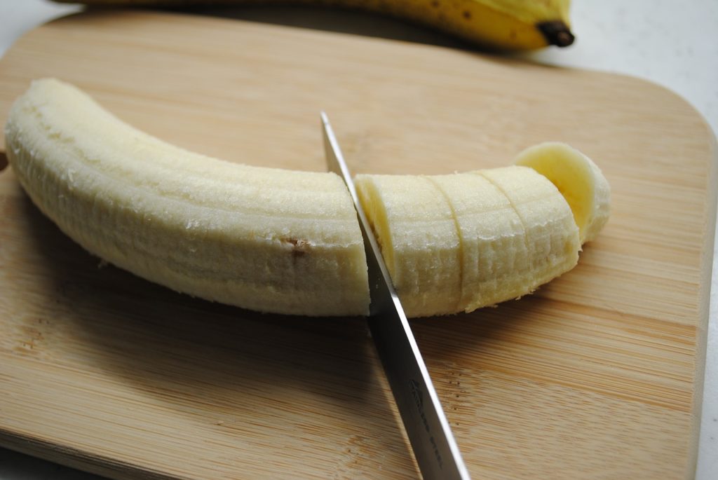 Obierz banany i pokrój je w grubsze plastry, a następnie przełóż do miski.