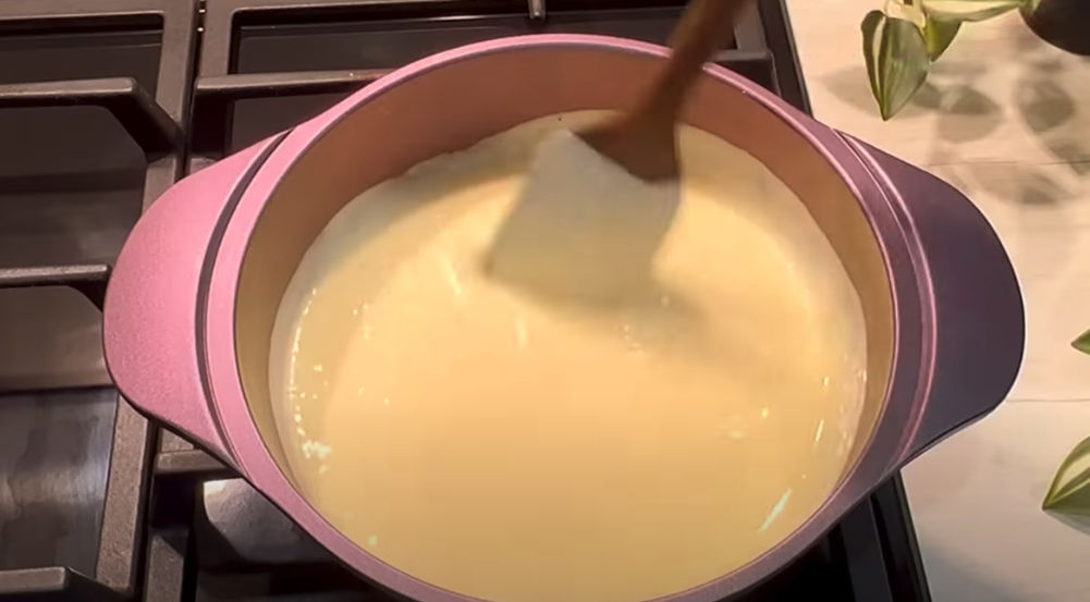W misce ubij jajka z cukrem i cukrem waniliowym, aż masa będzie puszysta. Dodaj skrobię kukurydzianą i dokładnie wymieszaj, aby uniknąć grudek. W garnku podgrzewaj jogurt grecki lub kwaśną śmietanę na średnim ogniu, cały czas mieszając. Stopniowo dodawaj mieszankę jajeczną do jogurtu, nie przerywając mieszania.