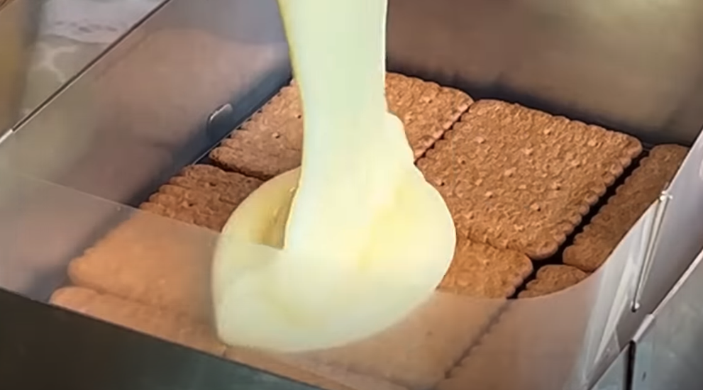 Gotuj krem na średnim ogniu, aż zgęstnieje (ciągle mieszając, aby uniknąć przypalenia). Po zgęstnieniu zdejmij garnek z ognia i dodaj masło, mieszając, aż się rozpuści i połączy z kremem. Pozostaw krem do ostygnięcia. Przygotuj formę o wymiarach 15×20 cm. Na dno formy ułóż ciasteczka (herbatniki), tworząc pierwszą warstwę.