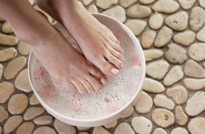 Do miski wlej wodę i dodaj kilka łyżek sody. Wymieszaj i mocz stopy przez 30 minut. Po tym czasie, tarką lub pumeksem usuń zmiękczony i złuszczony naskórek.
