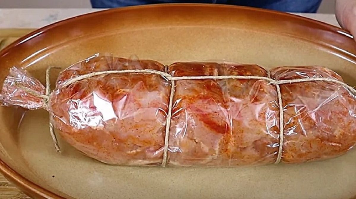 Ugotowane mięso posiekaj drobno lub zmiel w maszynce do mięsa razem z czosnkiem. Dodaj sól, pieprz i paprykę do smaku, wymieszaj. Dodaj trochę schłodzonego bulionu drobiowego do mięsa i wymieszaj. Przykryj mięso mielone folią spożywczą i wstaw do lodówki na 10-12 godzin. Posyp folię spożywczą papryką i posmaruj ją mięsem. Zwiń folię w rolkę, pociągnij sznurkiem.