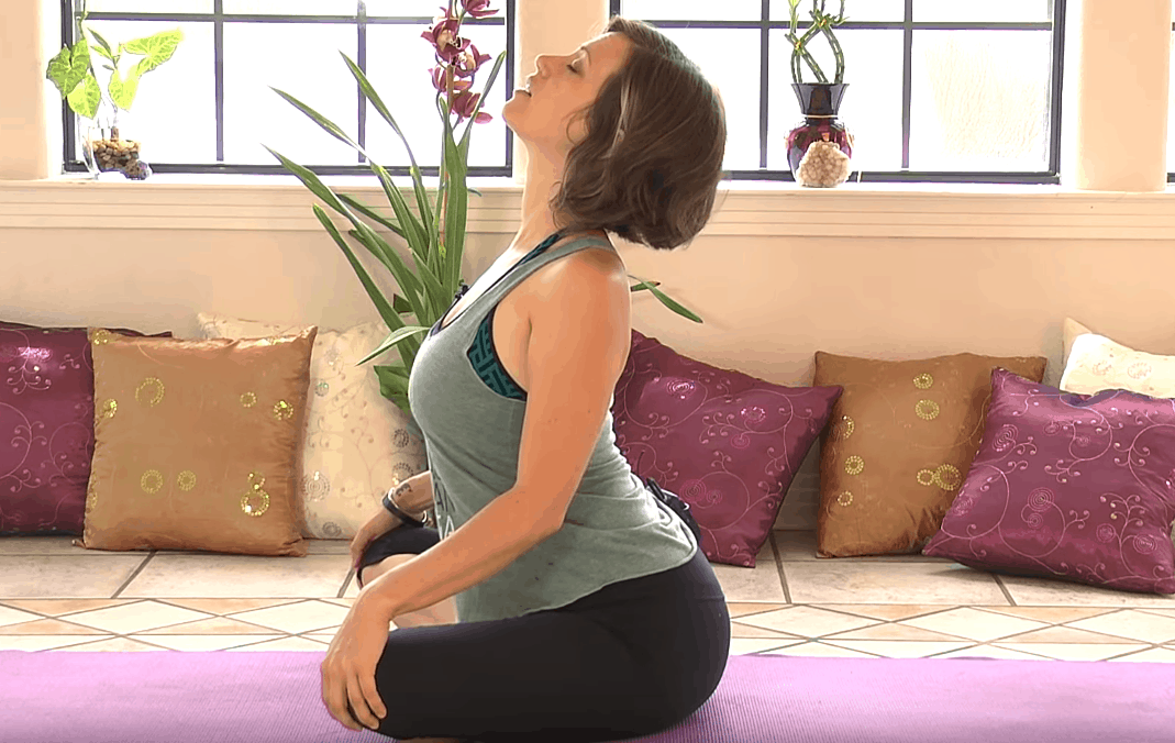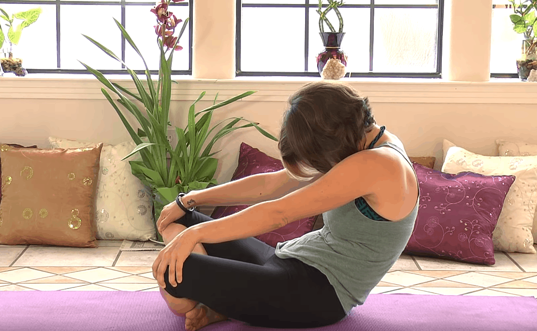 Usiądź wygodnie po turecku i połóż dłonie na kolanach, zrób wdech i powoli zacznij rozluźniać klatkę piersiową. Ściągnij łopatki i wygnij plecy w łuk. Następnie na wydechu przyciągnij głowę do klatki piersiowej, wyginając plecy trzymaj kolana z wyciągniętymi rękami do przodu.