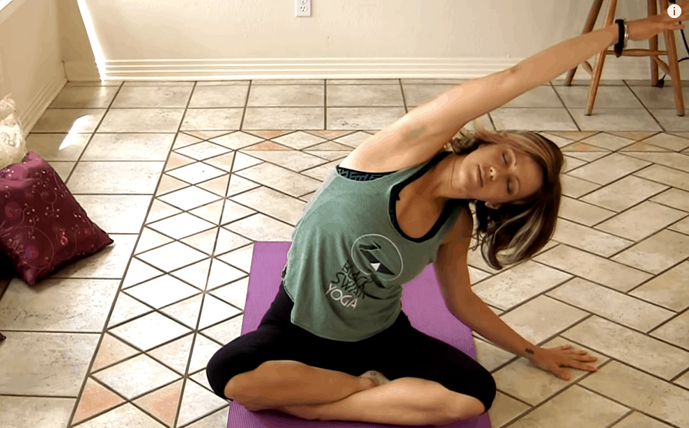 Zrób głęboki wydech aż poczujesz jak twój kręgosłup wydłuża się – powtarzaj tak kilka razy. Następnie powróć do pozycji siedzącej i wyciągnij prawe ramie wysoko nad głowę – trzymając jednocześnie lewą rękę na ziemi.