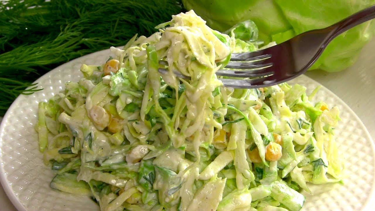 Poszatkować kapustę. Umytego ogórka pokroić w plasterki a później w paski (lub zetrzeć na tarce o grubych oczkach). Obrane i pokrojone jabłko skropić sokiem z cytryny (lub zetrzeć na tarce o grubych oczkach). Składniki wymieszać w misce, dodać posiekany koperek, kukurydzę, sól oraz przyprawy, jogurt lub śmietanę i dobrze wymieszać.