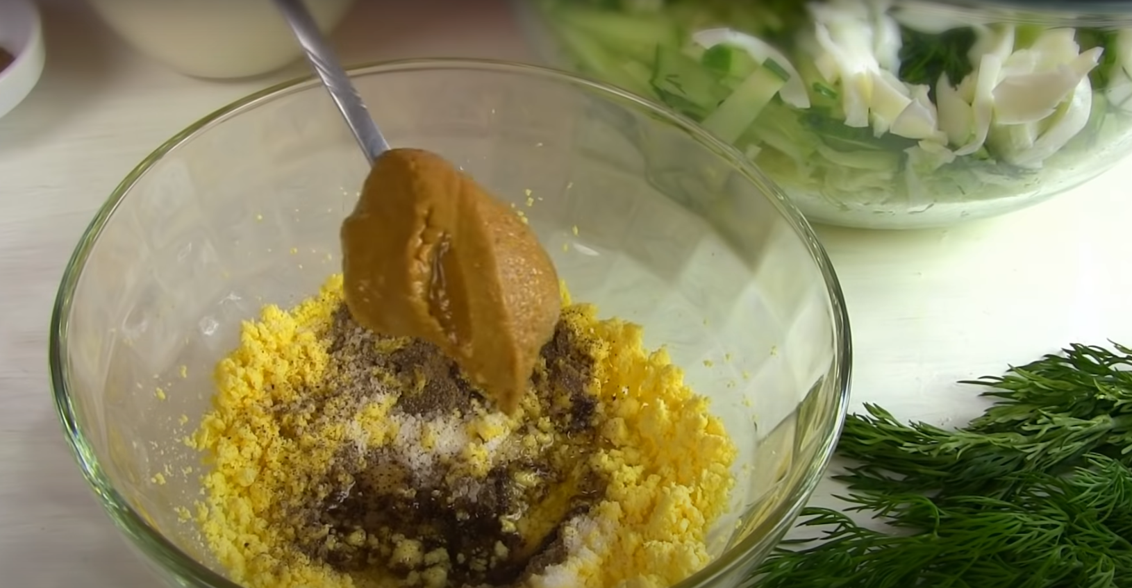 Poszatkować kapustę. Ogórka pokroić w plasterki a później w paski (lub zetrzeć na tarce o grubych oczkach). Dodać posiekaną kolendrę i koperek. Z ugotowanych jajek białka oddzielić od żółtek. Białka pokroić i dodać do warzyw, a żółtka w oddzielnym naczyniu rozgnieść widelcem.