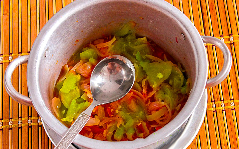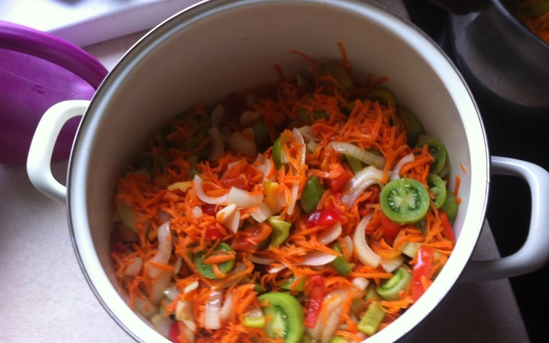 W garnku umieszczamy warzywa, olej, cukier, ocet i sól, możemy także doprawić pieprzem i odstawiamy na minimum 1 godzinę. Po tym czasie stawiamy garnek na kuchenkę i wszystko gotujemy ok 15 minut.