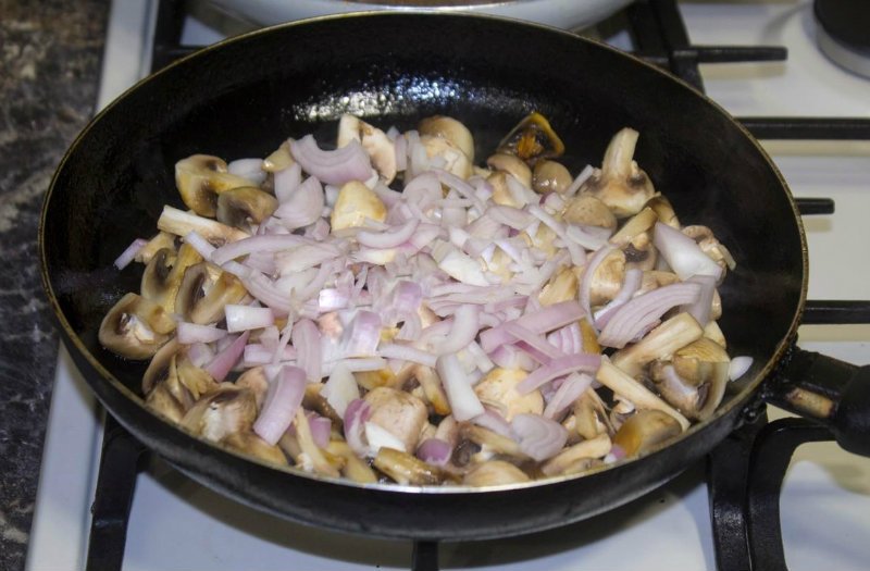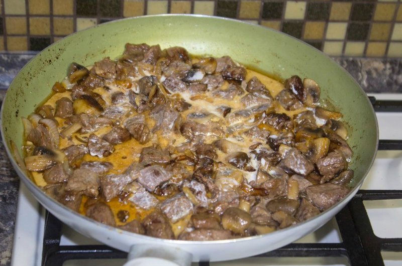 Pokrój cebulę w cieńsze paski, grzyby w grubsze plasterki. Rozpuść tłuszcz na patelni, dodaj warzywa i poczekaj, aż się podduszą. Wołowinę pokrój w niewielkie kawałki, dodaj do grzybów. Całość podsmażaj przez niecałe 10 minut. Dodaj musztardę, wodę i koncentrat.