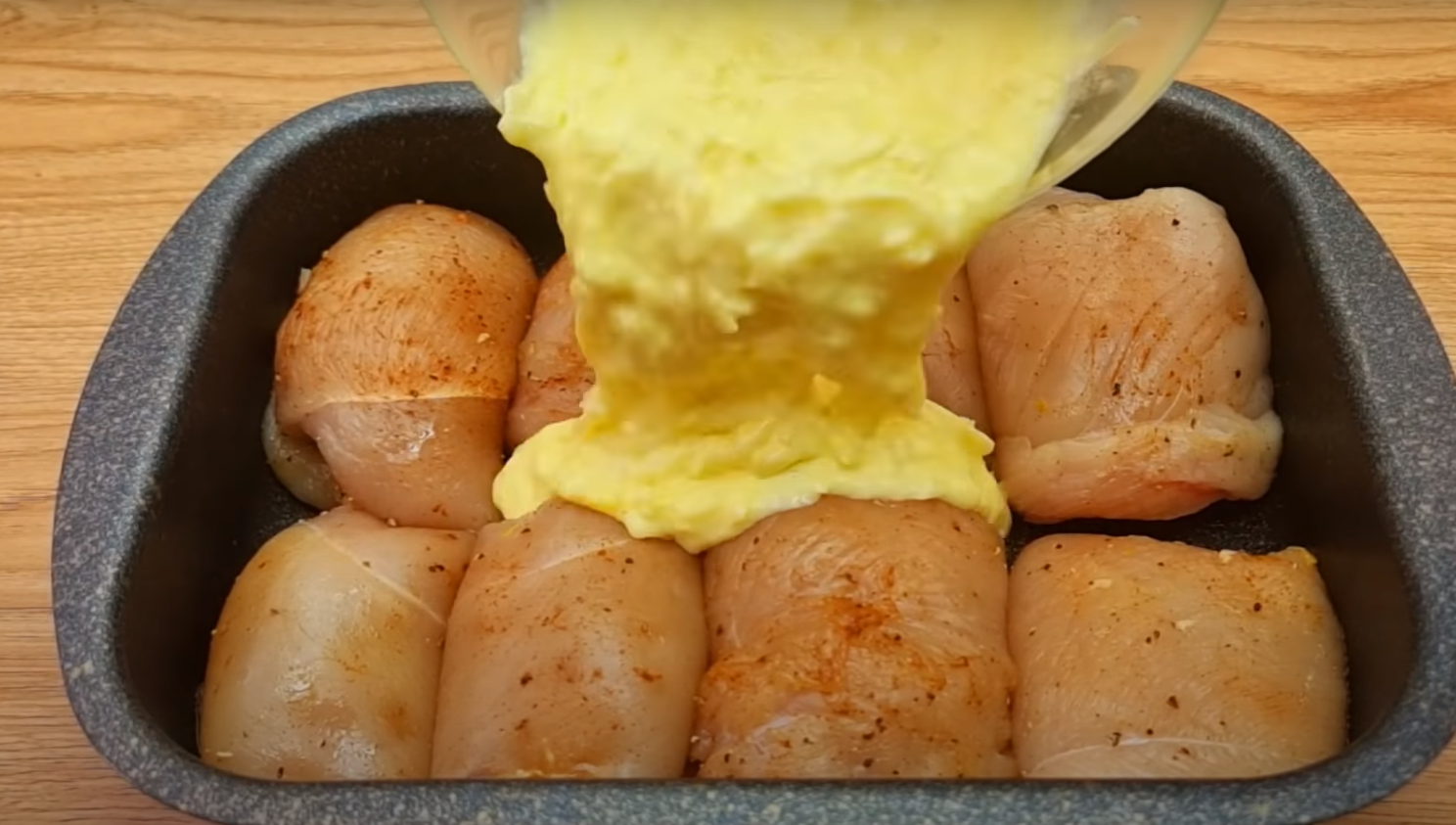 Roladki należy ułożyć na blasze do pieczenia. Następnie drugą połowę sera mieszamy z jajkiem i jogurtem oraz solą. Taką mieszanką polewamy roladki znajdujące się na blasze.
