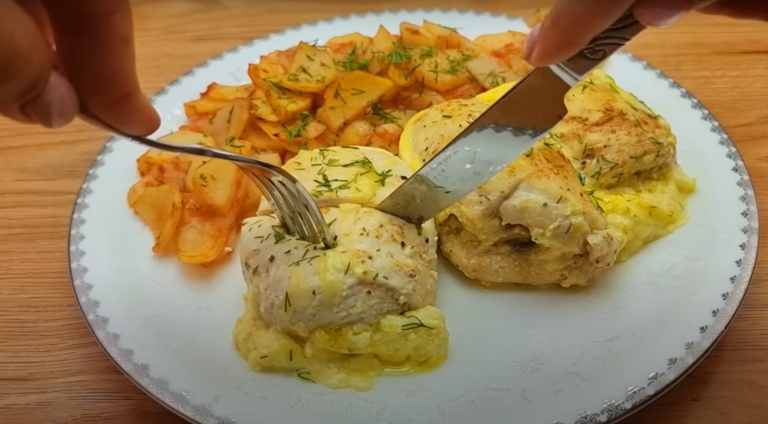W ten sposób uzyskaliśmy farsz, który kładziemy na wcześniej przygotowaną pierś, którą zawijamy w roladki.