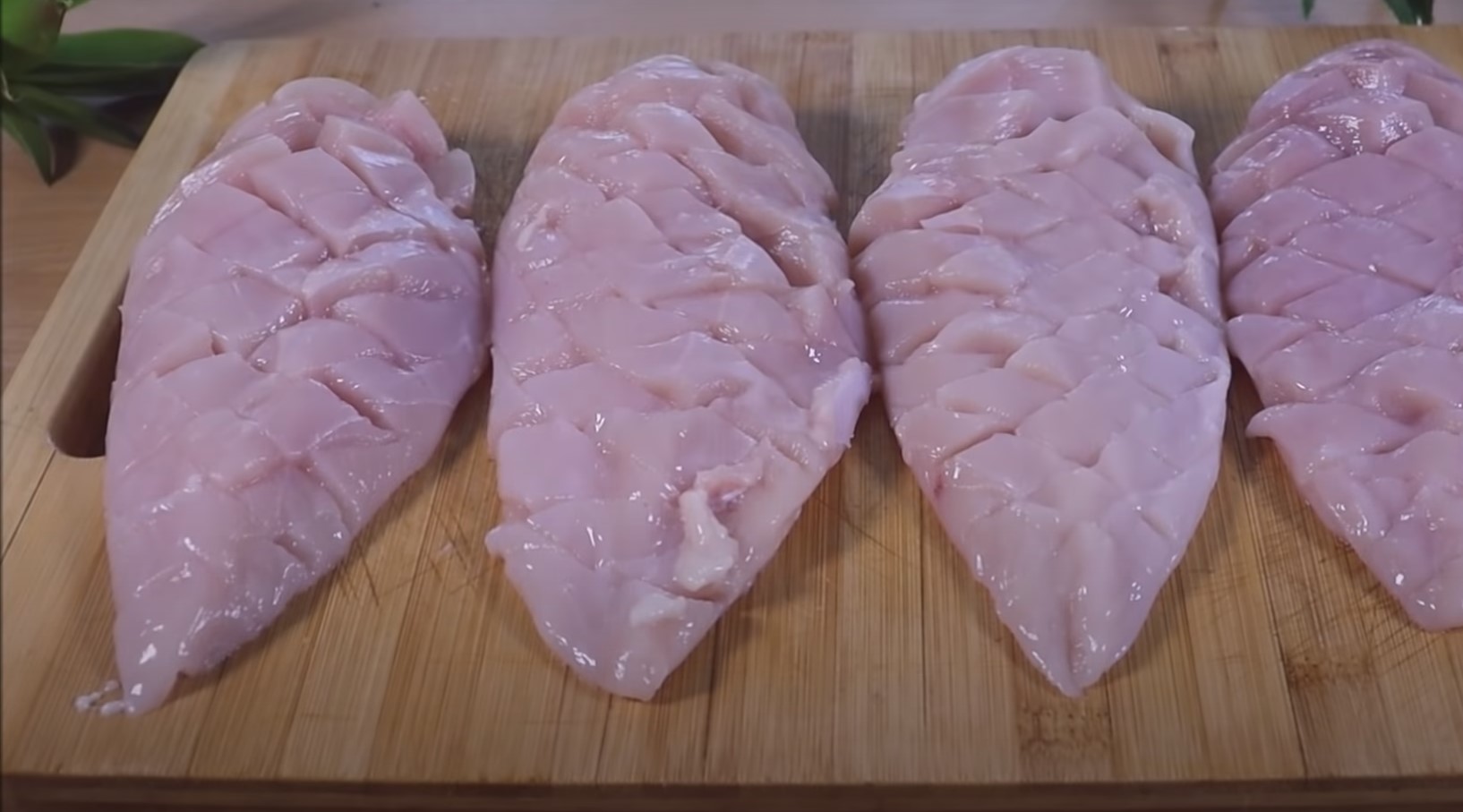 Następnie przygotuj pierś z kurczaka. Każdą z piersi natnij z jednej strony, tak by powstał kształt siatki.