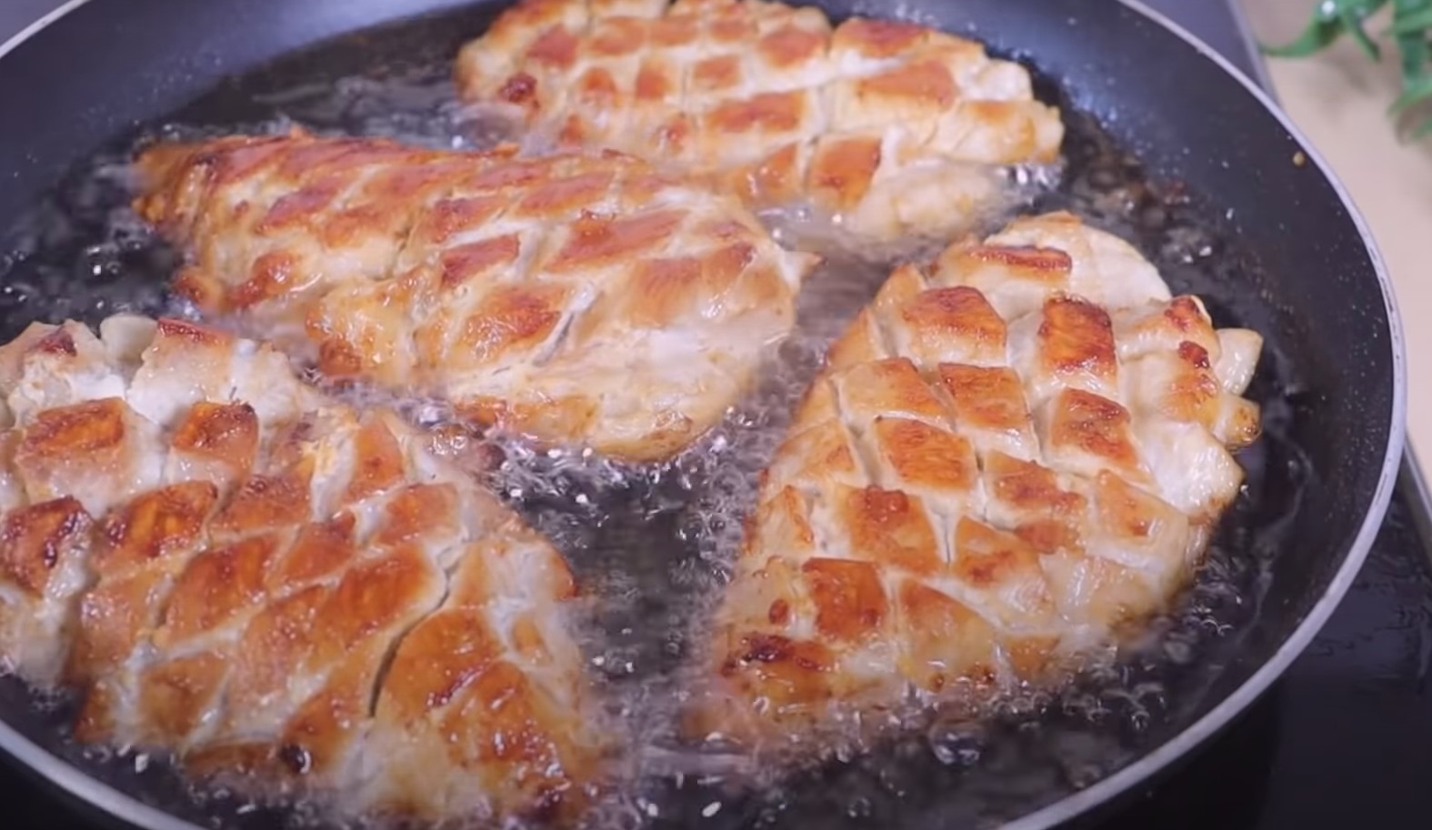 Na patelni dobrze rozgrzej olej i smaż piersi z kurczaka na złocisty kolor.