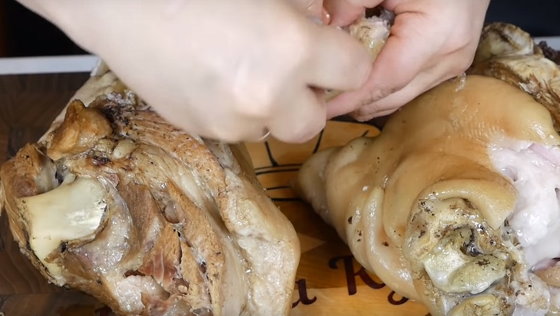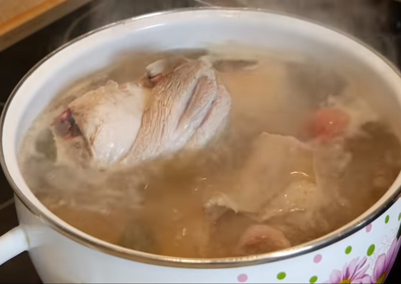 Następnie przykryć pokrywką i doprowadzić do wrzenia. Po zmniejszeniu temperatury, usuwać pianę łyżką, posolić i gotować przez 3-4 godziny, przykrywając pokrywką, ale nie szczelnie. Co godzinę obrócić mięso w garnku, aby równomiernie się ugotowało. Wyjąć ugotowane mięso z garnka i pozwolić mu ostygnąć.