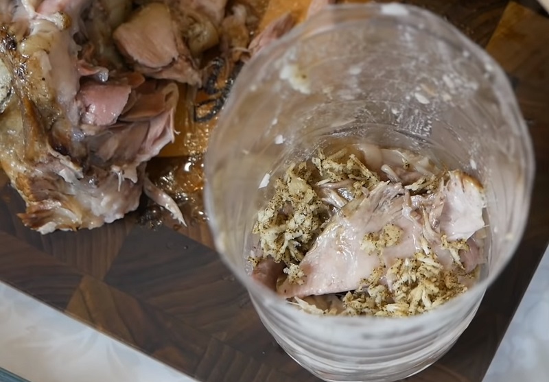 Następnie ręcznie rozdzielić na duże części, oczyszczając z kości itp. Drobną tarką zetrzeć czosnek, dodać zmielony pieprz i wymieszać. Plastikową butelkę odciąć u góry i wkładać do niej kawałki mięsa naprzemiennie z czosnkiem. Wlać 200-250 ml wody pozostałej z gotowania mięsa przez sito i równomiernie rozprowadzić po butelce za pomocą łyżki.