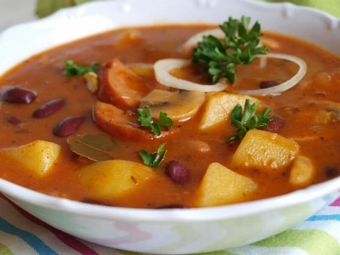 Cebulę drobno posiekać i zeszklić na rozgrzanym oleju. Gdy cebula zeszkli się na złoty kolor dodać pokrojoną kiełbasę i po chwili ziemniaki. Doprawiamy czerwoną papryką, mieszamy, zalewamy wodą i zalewamy bulionem mięsnym.
