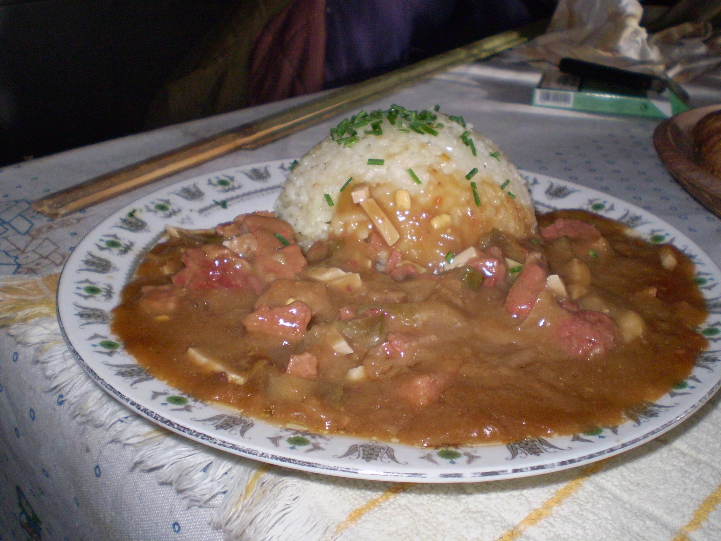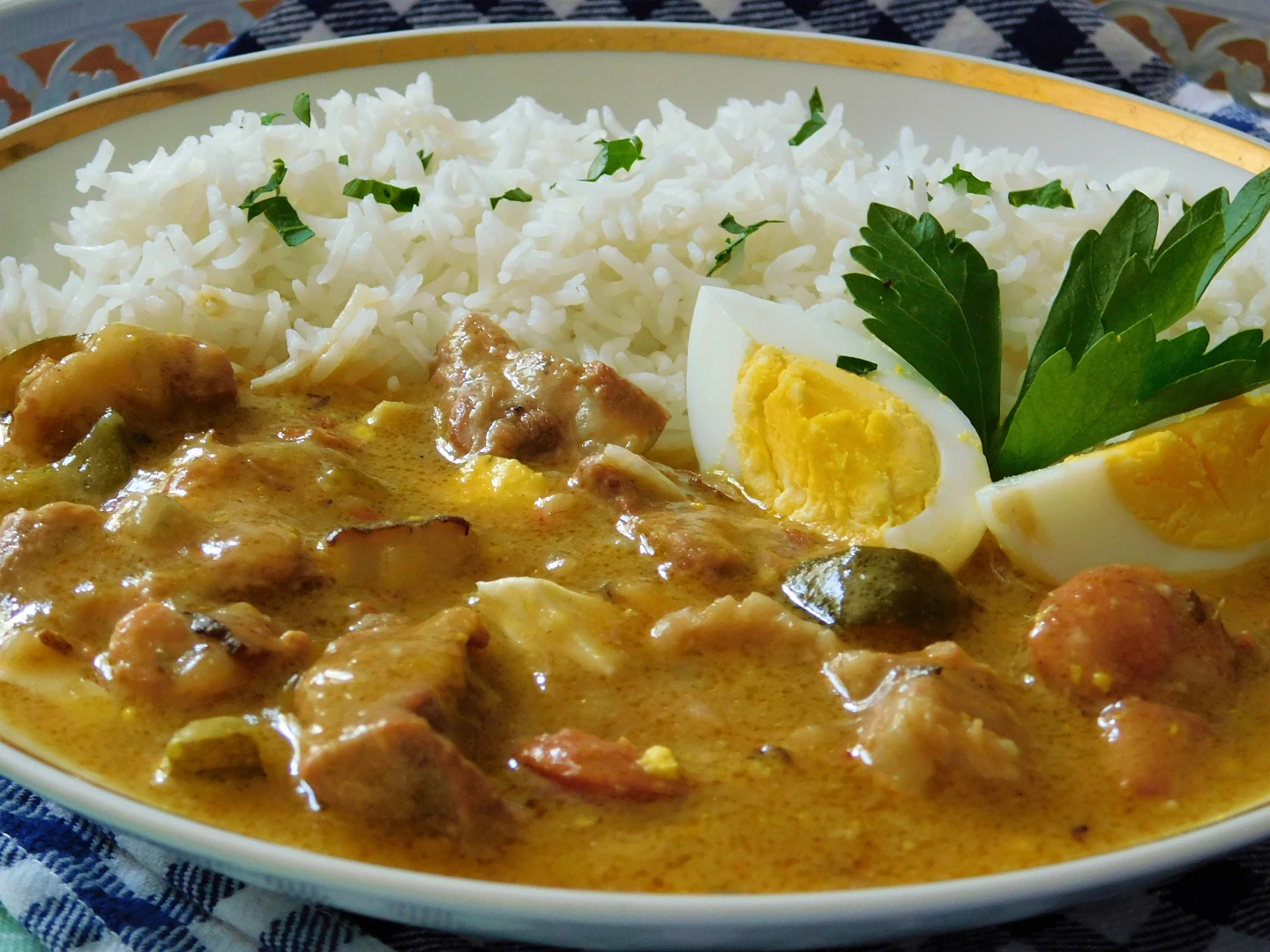 Zimną wodę mieszamy z 3 łyżkami mąki pszennej i wlewamy do sosu (zamiast mąki można zagęścić bulionem). W razie potrzeby rozcieńcz sos wodą. Gotuj powoli przez kolejne 15-20 minut. Na koniec dodać posiekane jajka i doprawić gotowy sos. Odpowiednim dodatkiem jest ryż gotowany na parze.