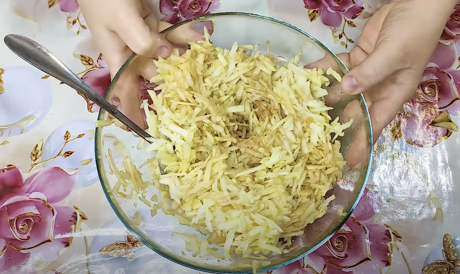 Zetrzyj jabłka i wymieszaj je z cukrem, a potem w misce zmieszaj jajka z cukrem, wsyp wanilię i ręcznie wymieszaj przesianą mąkę z proszkiem do pieczenia.