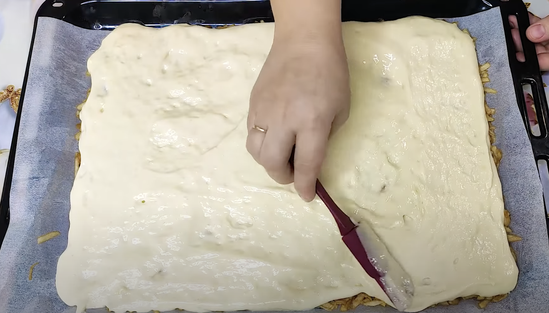 Teraz połóż ciasto na jabłkach i wygładź jego powierzchnię. Następnie umieść je w piekarniku i piecz przez 25 minut, rozgrzej piekarnik do temperatury 180 stopni, apotem obróć ciasto używając do tego deski bądź papieru do pieczenia.