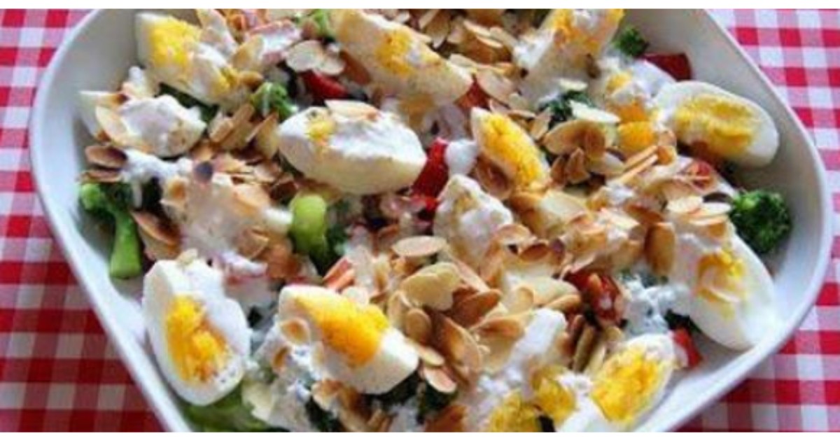 Do miski przełóż zblanszowany, ale miękki brokuł, pieczoną paprykę i jajka. Dopraw solą i pieprzem do smaku. Jogurt naturalny, wymieszaj z przeciśniętym przez praskę czosnkiem, dopraw solą i pieprzem. Polej przygotowanym sosem sałatkę brokułową z jajkiem i posyp całość uprażonymi płatkami migdałów. Smacznego!