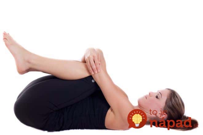 Leżąc na plecach, odpręż się. Do ciała przytul kolana, rękami trzymając stopy. Pozostań w tej pozycji przez minutę.