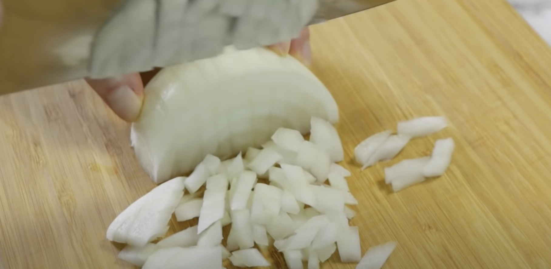 W czasie oczekiwania należy obrać i drobno posiekać przygotowaną cebulę.