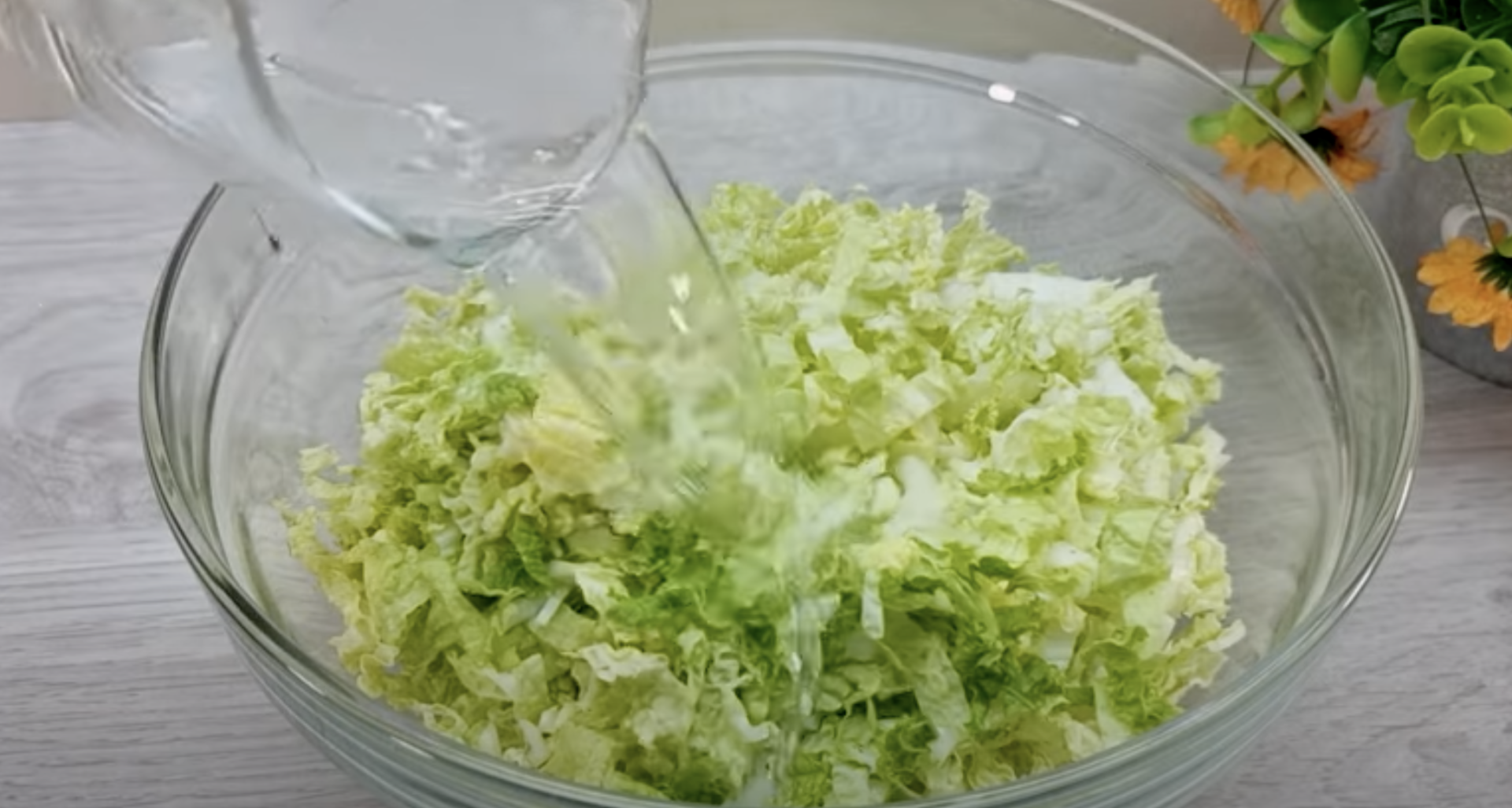 Przygotowaną kapustę pekińską pokrój na drobne kawałki, zalej 0,5 l wrzącej wody i odstaw na chwilę, żeby przestygła.