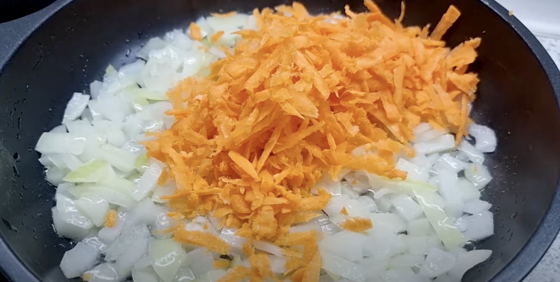 Marchewkę zetrzyj na tarce o grubych oczkach, a cebulę drobno posiekaj i delikatnie podsmaż na patelni.