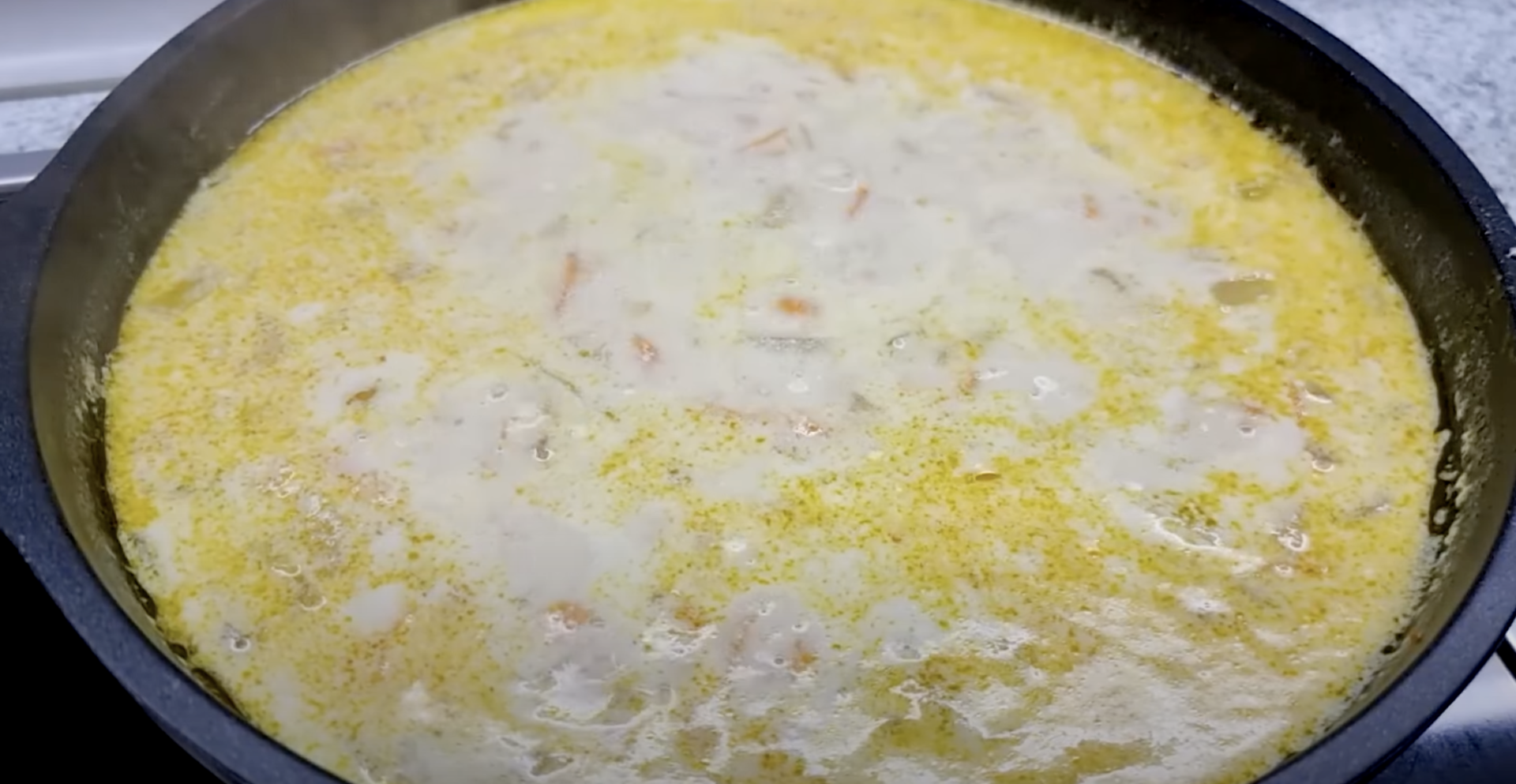 Do podsmażonej cebuli dodaj marchewkę, a następnie do całości wrzuć czosnek oraz wlej przygotowaną śmietanę oraz wodę.